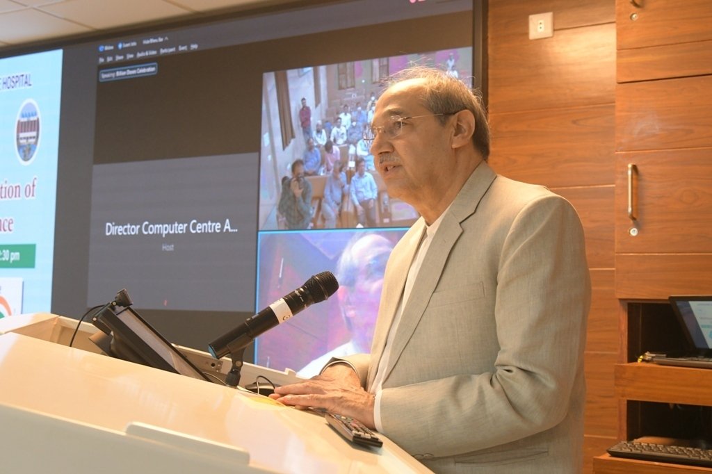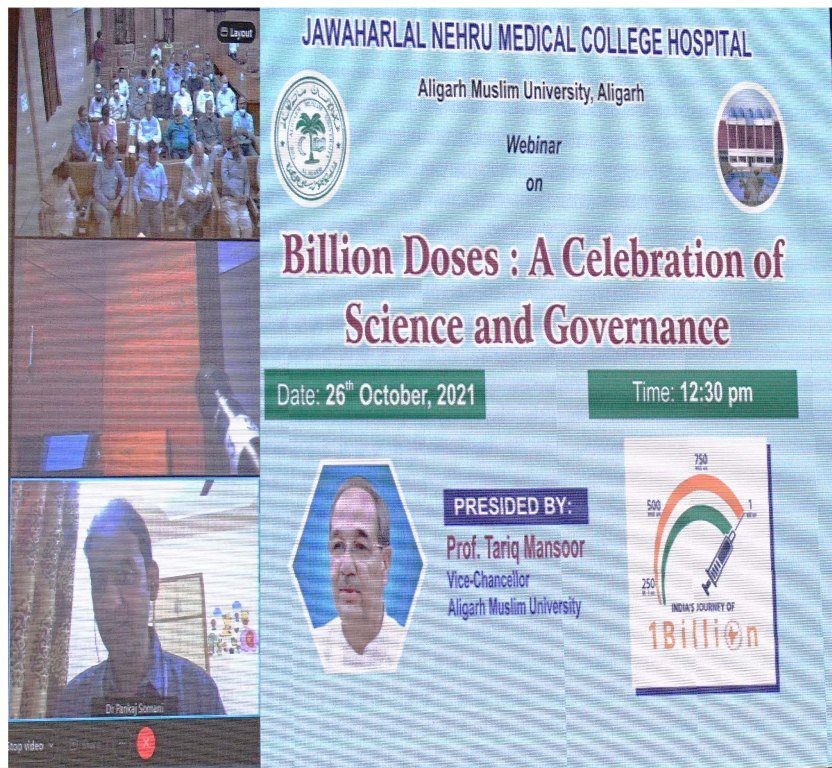 मनायाअलीगढ़, 26 अक्टूबरः अलीगढ़ मुस्लिम विश्वविद्यालय ने देश में कोविड-19 वैक्सीन की 100 करोड़ खुराक दिये जाने का मंगलवार को जश्न मनाया।सर्जरी विभाग, जेएन मेडिकल कॉलेज, एएमयू के संगोष्ठी कक्ष में “एक बिलियन डोज़ः साइंस एवं शासन का जश्न” शीर्षक से एक वेबिनार का आयोजन किया गया, जिसमें वरिष्ठ डाक्टरों और विशेषज्ञों तथा दुनिया भर से पूर्व छात्रों ने भाग लिया।कुलपति प्रोफेसर तारिक मंसूर ने वेबिनार की अध्यक्षता करते हुए उन सभी स्वास्थ्य कर्मियों को बधाई दी, जिनके अथक प्रयासों से देश को कोविड-19 टीकाकरण अभियान में 100 करोड़ खुराक तक पहुंचने में सफलता मिली।