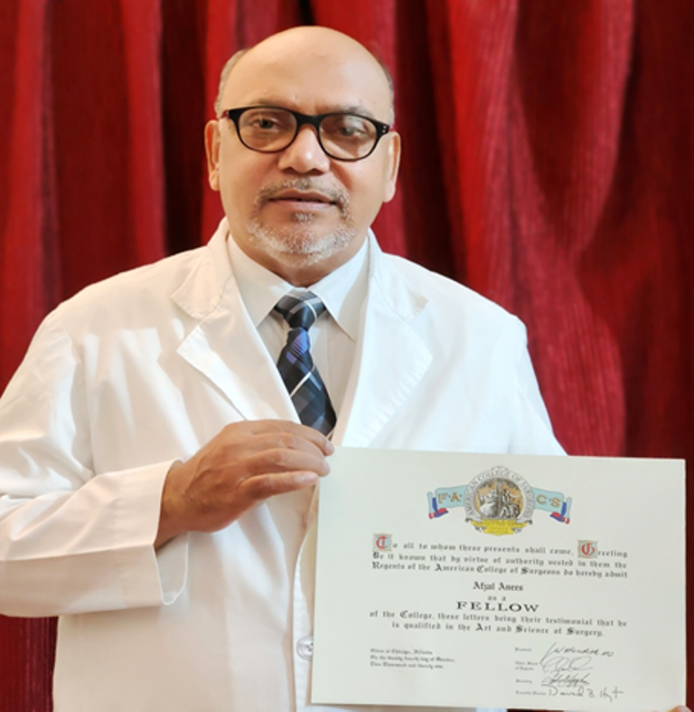 अलीगढ़, 1 नवंबरः अलीगढ़ मुस्लिम विश्वविद्यालय के जवाहरलाल नेहरू मेडिकल कालेज में सर्जरी विभाग के अध्यक्ष, प्रोफेसर अफजल अनीस को अमेरिकन कालेज आफ सर्जन्स (एफएसीएस) की प्रतिष्ठित फैलोशिप से सम्मानित किया गया है। प्रोफेसर अफजल को यह फैलोशिप उनकी शिक्षा और प्रशिक्षण, पेशेवर योग्यता, सर्जिकल क्षमता और नैतिक आचरण पर अमेरिकन कालेज आफ सर्जन्स द्वारा स्थापित मानकों के अनुरूप पाये जाने पर प्रदान की गई है।प्रोफेसर अफजल अनीस इंटरनेशनल कालेज आफ सर्जन्स (एफआईसीएस) के फेलो भी हैं और एसोसिएशन आफ इंडियन सर्जन्स (एफआईसीएस) की फेलोशिप और मिनिमल एक्सेस सर्जरी (एफएमएएस) में भी फेलोशिप प्राप्त कर चुके हैं।प्रोफेसर अनीस के पास एफएसीआरएसआई और एफआईएजीईएसयोग्यताएं भी हैं।जीआई सर्जरी, कोलोरेक्टल सर्जरी, लैप्रोस्कोपी और एंडोस्कोपी उनके प्रमुख क्षेत्र हैं। उन्होंने 6000 से अधिक ओपन और लेप्रोस्कोपिक सर्जिकल प्रक्रियाएं और 2500 से अधिक नैदानिक तथा चिकित्सीय एंडोस्कोपी अंजाम दी हैं। प्रोफेसर अनीस जेएनएमसी में कोलो-रेक्टल स्पेशल क्लिनिक के प्रमुख हैं।