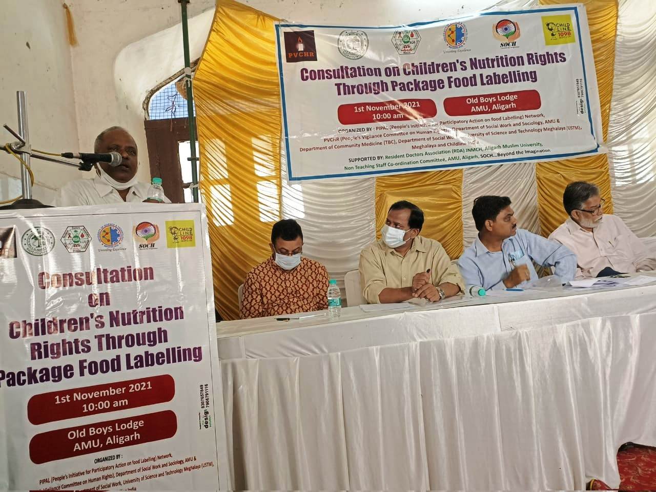 उपभोक्ता मित्रतापूर्ण और व्याख्यात्मक खाद्य लेबल के लिए अपने अभियान को जारी रखते हुए, मानवाधिकार जननिगरानी समिति (पीवीसीएचआर) पीपुल्स इनिशिएटिव फॉर पार्टिसिपेटरी एक्शन ऑन फूड लेबलिंग (पीपल), सामाजिक कार्य और समाजशास्त्र विभाग, अलीगढ़ मुस्लिम विश्वविद्यालय (एएमयू) और सामुदायिक चिकित्सा विभाग, सामाजिक कार्य विभाग, विज्ञान और प्रौद्योगिकी विश्वविद्यालय मेघालय (यूएसटीएम), मेघालय और चाइल्डलाइन इंडिया ने अलीगढ़ में एक संयुक्त परामर्श का आयोजन ओल्ड बायज लाज, एएमयू में किया गया।परामर्श में कहा गया है कि बचपन में मोटापा, हृदय रोग, मधुमेह, और गैर-संचारी रोगों के समग्र बोझ को नियंत्रित करने के लिए अल्ट्रा प्रोसेस्ड खाद्य और पेय पदार्थों की अधिक खपत के साथ बढ़ते सबूत हैं।डाक्टर अली जाफर आब्दी, सहायक प्रोफेसर, सामुदायिक चिकित्सा जवाहरलाल नेहरू मेडिकल कालेज (जेएनएमसी), एएमयू ने कहा कि 14 मिलियन से अधिक भारतीय बच्चे मोटापे से ग्रस्त या अधिक वजन वाले हैं, उन्हें एनसीडी विकसित करने का जोखिम डालते हैं पोषण थ्रेसहोल्ड जैसे नियामक कदम जो उद्योग के लिए वैश्विक और वैज्ञानिक मानकों के बराबर, अपने खाद्य उत्पादों को सुधारने और अपने खाद्य उत्पादों को स्वस्थ बनाने के लिए अनिवार्य बनाते हैं, मोटापा या मधुमेह महामारी को रोकने में एक लंबा सफर तय करेंगे।
