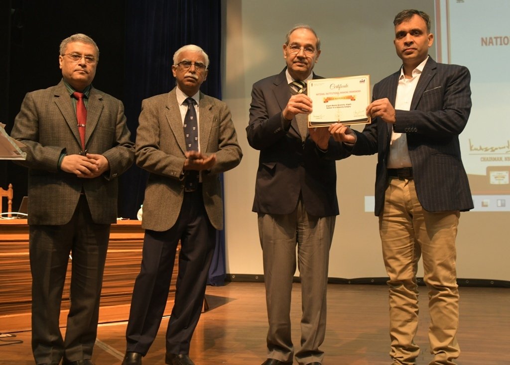 रजिस्ट्रार, श्री अब्दुल हमीद (आईपीएस) ने सभी विश्वविद्यालयों के बीच एएमयू की समग्र 10वीं रैंक के लिए प्रमाण पत्र और सभी संस्थानों और विश्वविद्यालयों के बीच विश्वविद्यालय की 18वीं रैंक के लिए प्रमाण पत्र प्राप्त किया। जबकि रिसर्च कैटेगरी में एएमयू की 24वीं रैंक का सर्टिफिकेट जीव विज्ञान संकाय के डीन अधिष्ठाता एवं डायरेक्टर एकेडमिक प्रोग्राम्स कमैटी, प्रोफेसर वसीम अहमद ने प्राप्त किया।